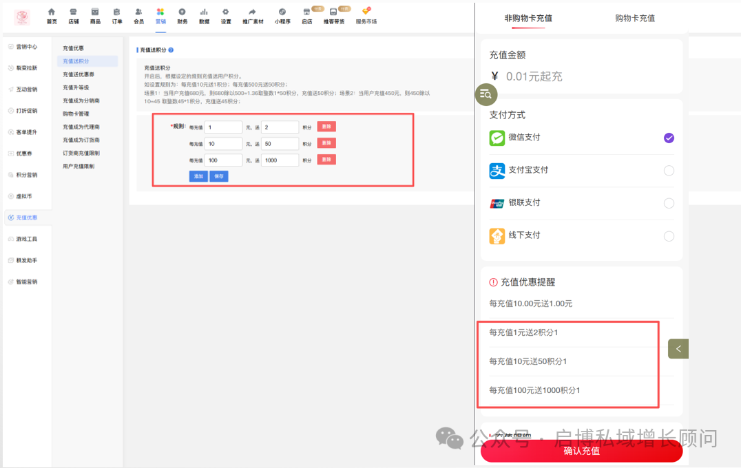 微分销亮点功能更新 第289期更新 运费按距离计价方式【新增】; 0元抽奖【优化】; 商品设置订货价【优化】; 附近门店组件【优化】; 积分日志【优化】; 功能名称【优化】; 充值送积分【优化】; 团队业绩统计【优化】; 幸运大转盘【优化】; 跨端跳转组件【优化】; 商品限购【优化】; 启博·微分销第289期准时为大家呈上,本期更新以优化为主,部分行踪功能可参见以上目录,详情可咨询产品顾问哦~ 下面跟我一起看看有哪些重点功能吧! 01 运费按距离计价方式【新增】 功能介绍: 新增门店配送方式新增按距离计算运费 根据选择的配送门店以及收货地址之间的距离计算运费 02 0元抽奖【优化】 功能介绍: 0元抽奖增加查看参与人操作,可以查看参与活动的会员 03 商品设置订货价【优化】 功能介绍: 批量设置订货价错误时会直接提示报错 04 附近门店组件【优化】 功能介绍: 附近门店组件增加标题是否显示设置,选择否则不展示顶部标题 05 积分日志【优化】 功能介绍: 积分日志列表增加会员ID筛选及导出 06 功能名称【优化】 功能介绍: 后台功能名称可自定义,移动端佣金明细中的提成支出文案 07 充值送积分【优化】 功能介绍: 充值送积分可以设置多条规则,根据充值余额匹配最近满足条件的规则计算赠送积分 08 团队业绩统计【优化】 功能介绍: 团队业绩统计订单笔数增加虚拟订单数显示 09 幸运大转盘【优化】 功能介绍: 大转盘游戏增加查看参与记录列表,可查看参与人 10 跨端跳转组件【优化】 功能介绍: 跨端跳转组件增加展示平台设置,可设置在公众号商城或小程序商城显示 11 商品限购【优化】 功能介绍: 商品设置限购可以根据会员等级进行限购设置