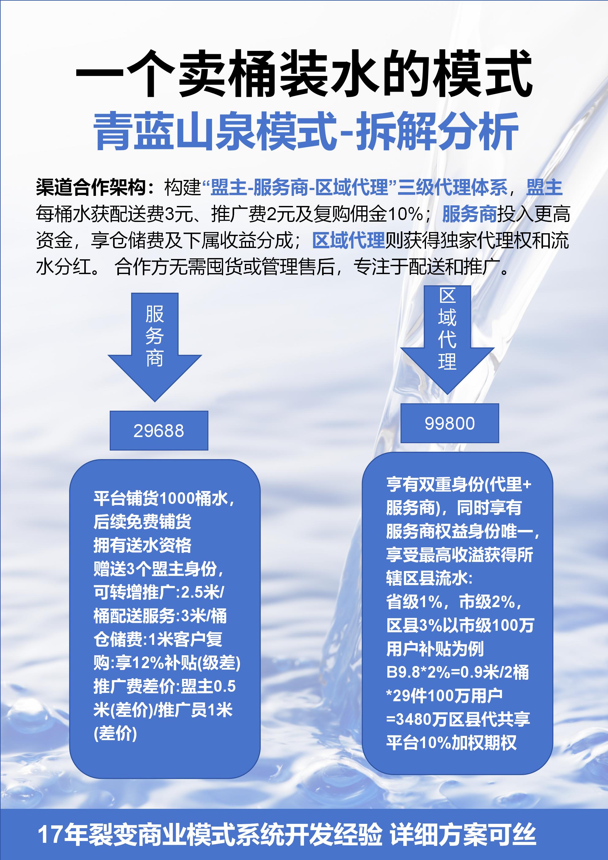 最后想说:青蓝山泉的模式,其实是把 “社交电商” 的逻辑,套在了 “刚需日用品” 上 —— 用低门槛让用户 “上车”,用分销让用户 “拉人”,用代理体系让资源方 “扎根”。但这套玩法的风险也很明显:如果返利、佣金的成本压不住,或者流量变现跟不上,很容易变成 “击鼓传花”。