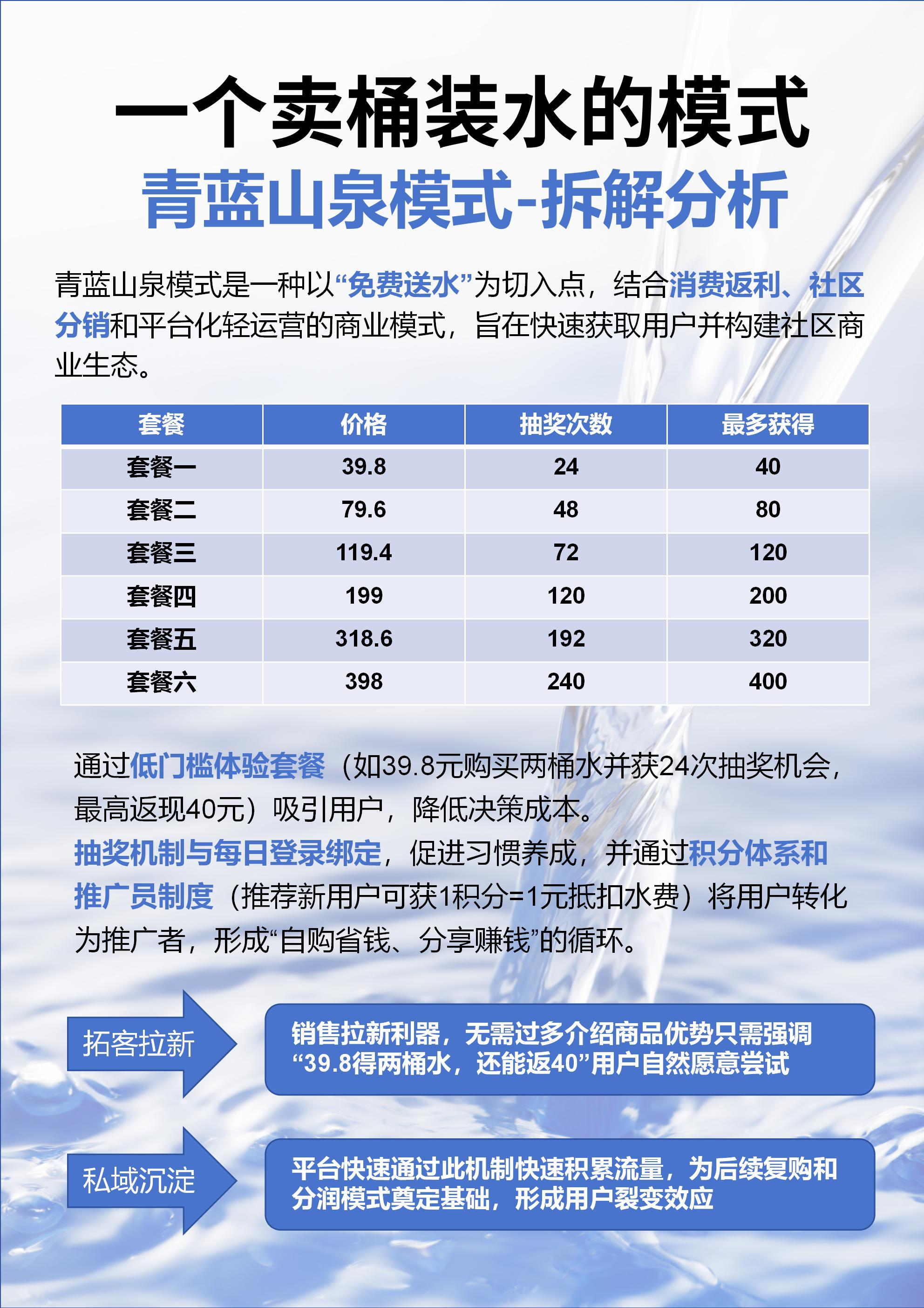青蓝山泉的获客逻辑很简单:用 “39.8 元买两桶水,还能抽 24 次奖、最高返 40 元” 的套餐,把用户的决策成本压到最低。