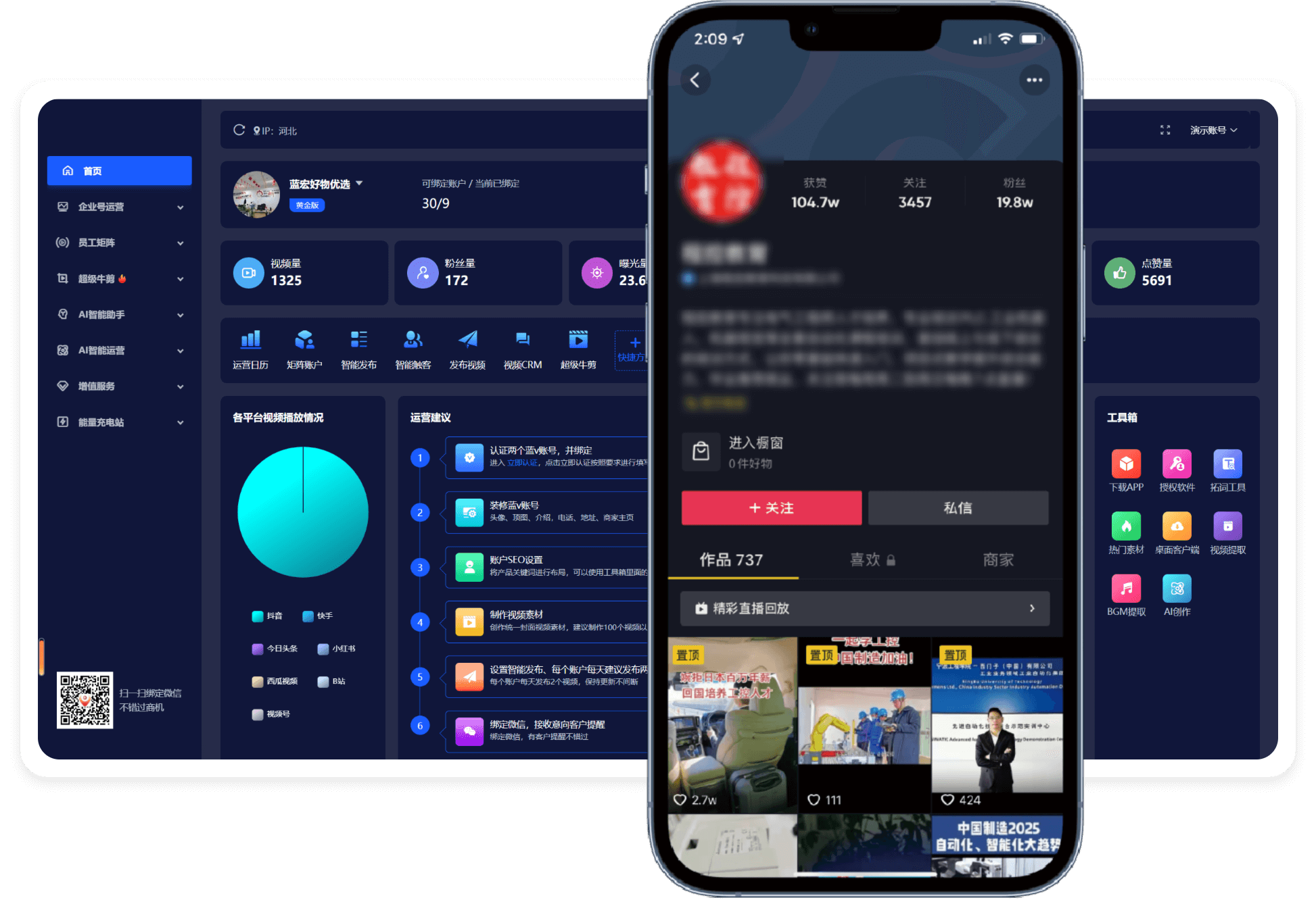 实现企业号视频、关注、粉丝等多重数据管理,同步绑定抖音、快手、头条等主流平台,通过客户信息同步,一站式管理企业账号
