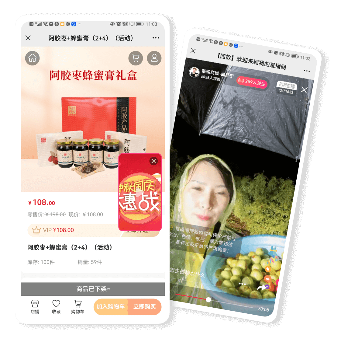 无缝对接微分销商城,无需跳转边看边买,形成引流-转化-复购的私域营销闭环