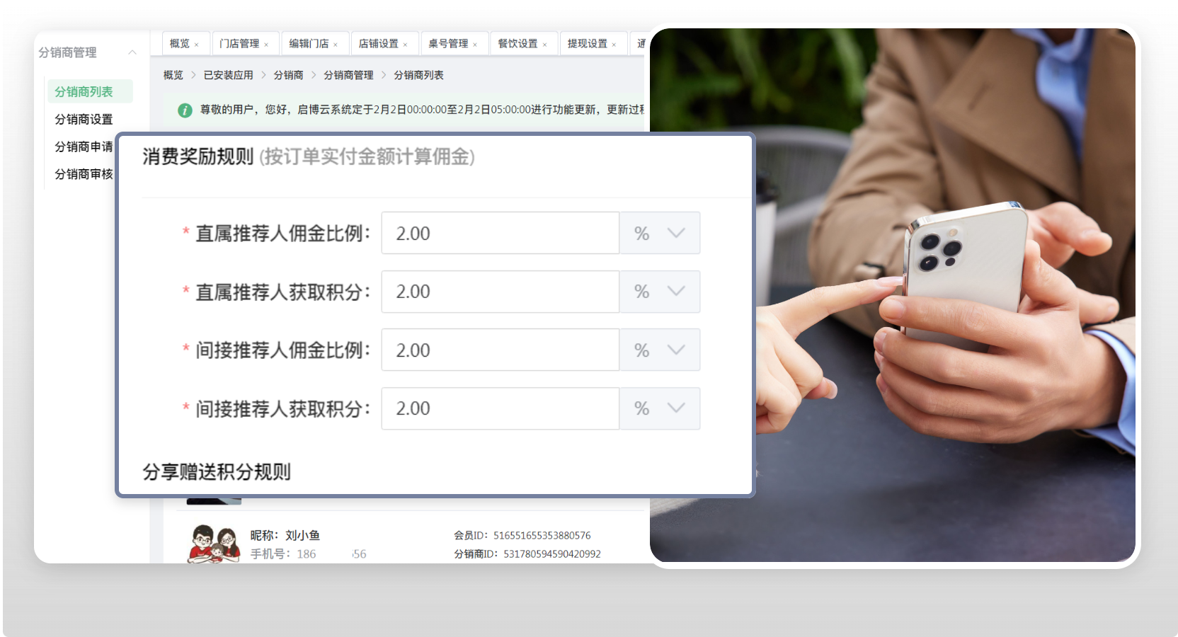 快速开启二级分销裂变模式,系统内置多种分销规则,快速配置实现分销返佣,佣金比例灵活设置,自动结算;分销等级可自动按条件升降级,促进推广员的推广积极性。