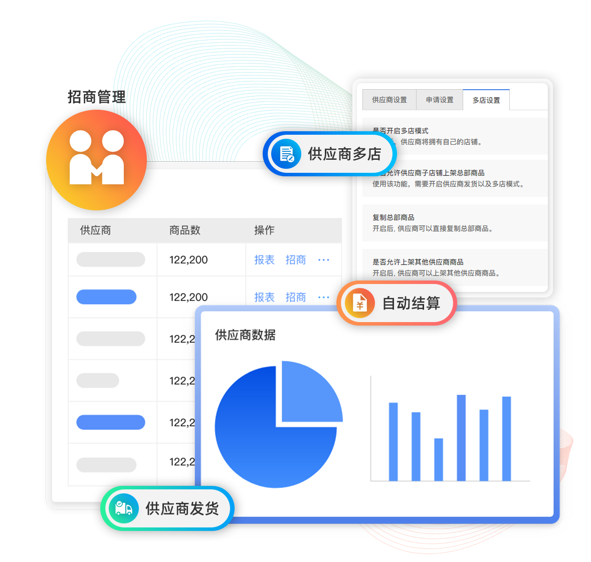 供应商、订货商模式快速打造平台运营模式,多供应商入驻,支持供应商发货,分账自动结