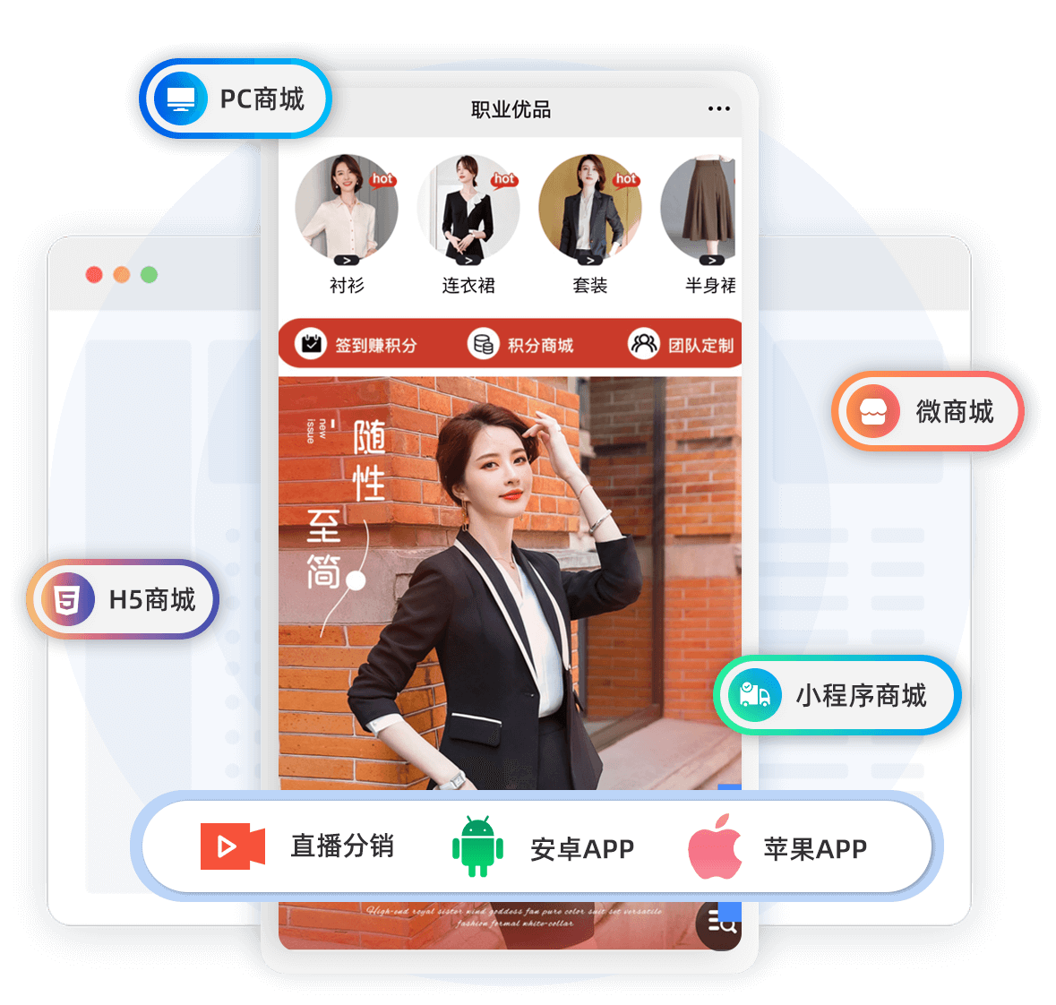 7大线上渠道,全线引流PC商城、微商城、小程序商城、H5商城、苹果安卓APP商城、直播商