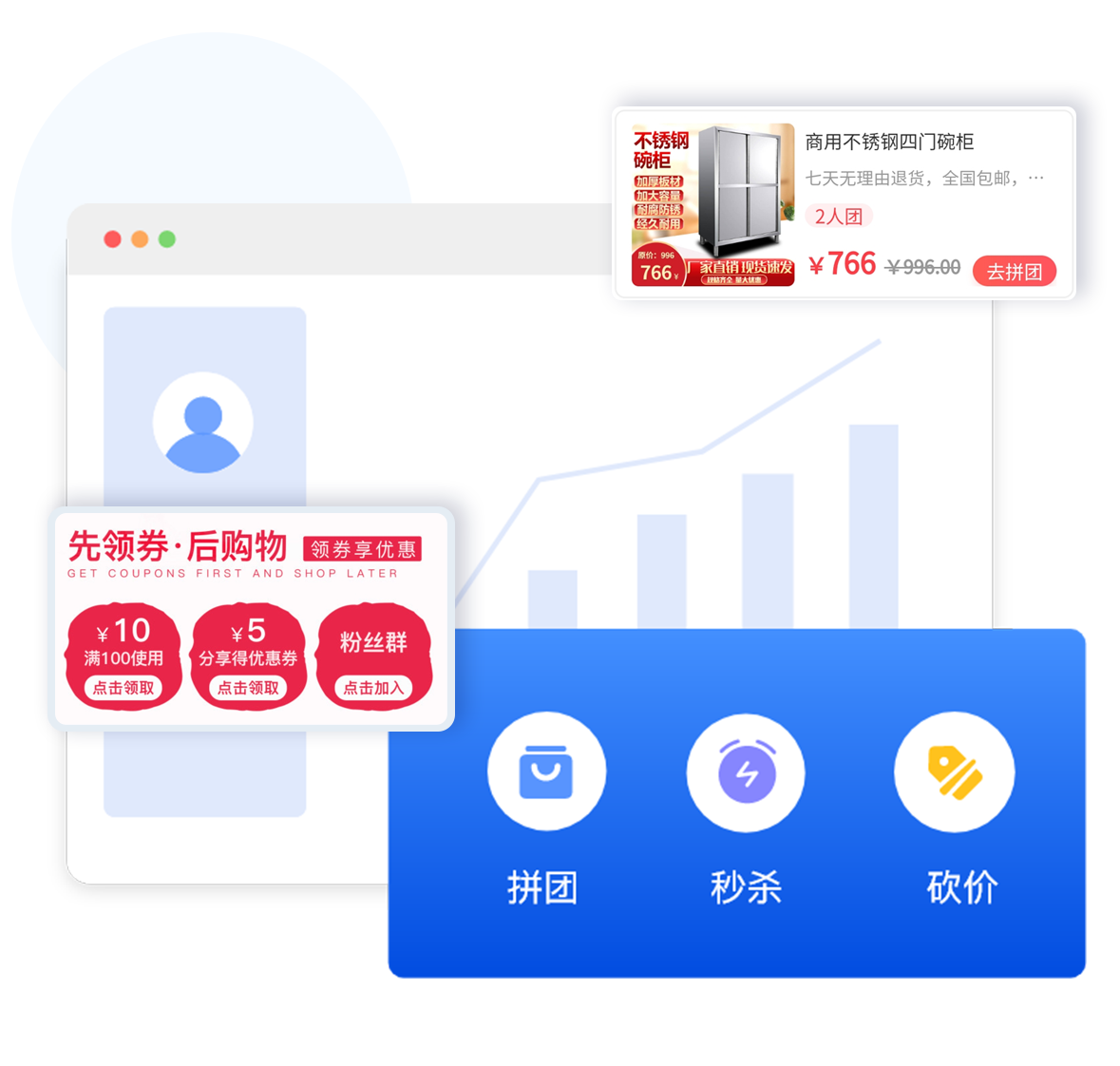 裂变拉新拼团、秒杀、砍价、群接龙等多种拉新玩法,实现商城粉丝倍增