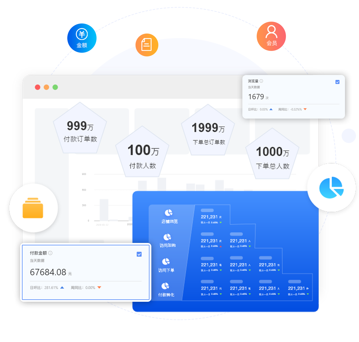 交易数据从下单人数、金额、次数、地域等全方位分析店铺经营情况,用数据促